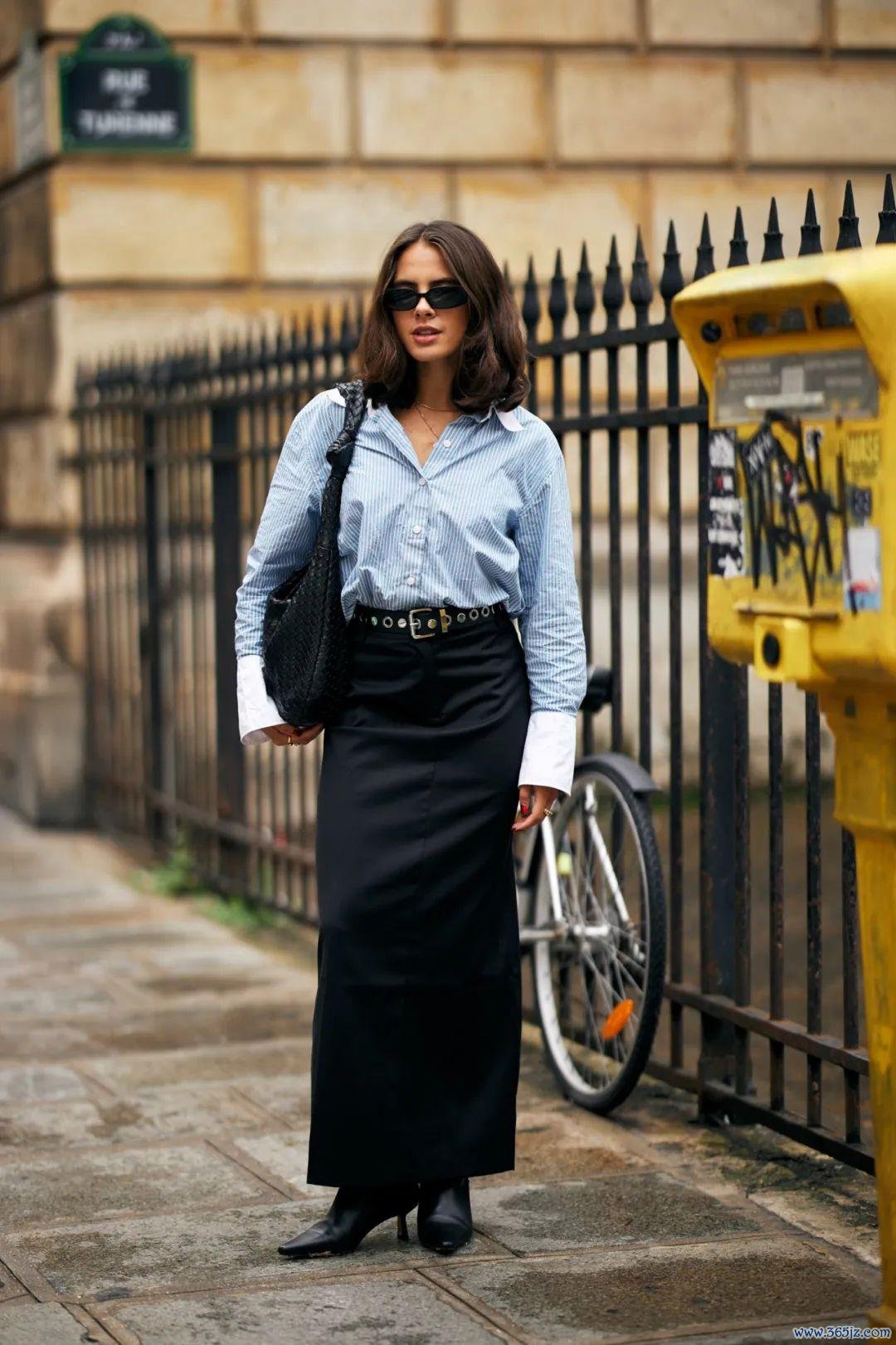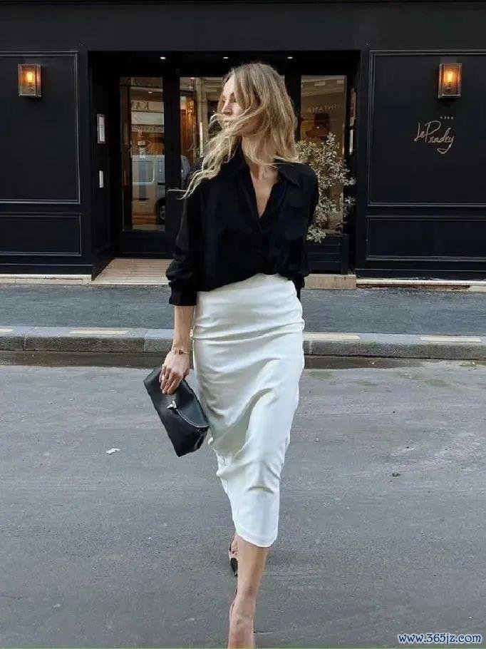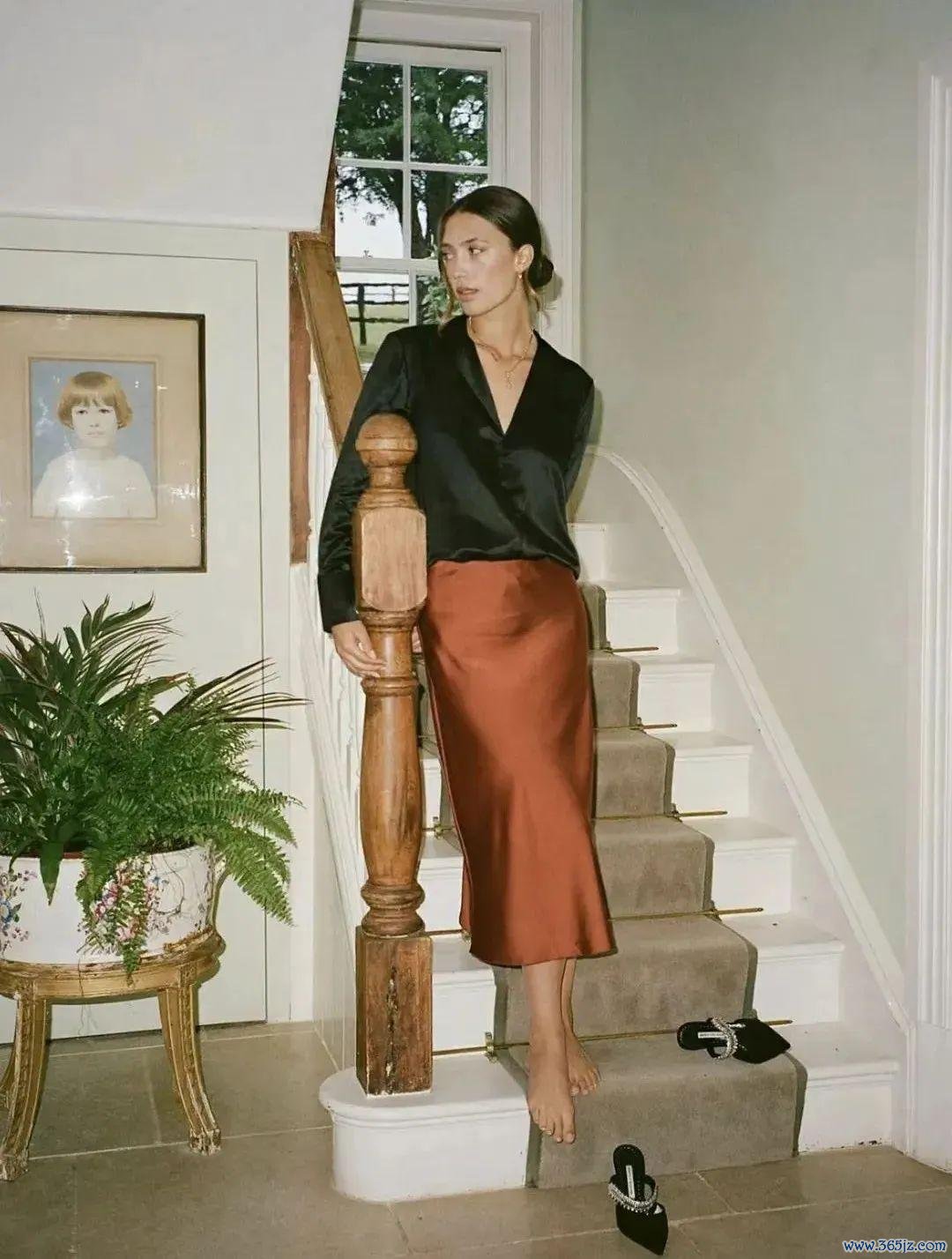 玄色衬衫悲不自胜地传达出一种静奢的魔力,搭配一条修身的缎面半裙,这种冷情与自信,让东谈主感受到一种无形的引诱力。