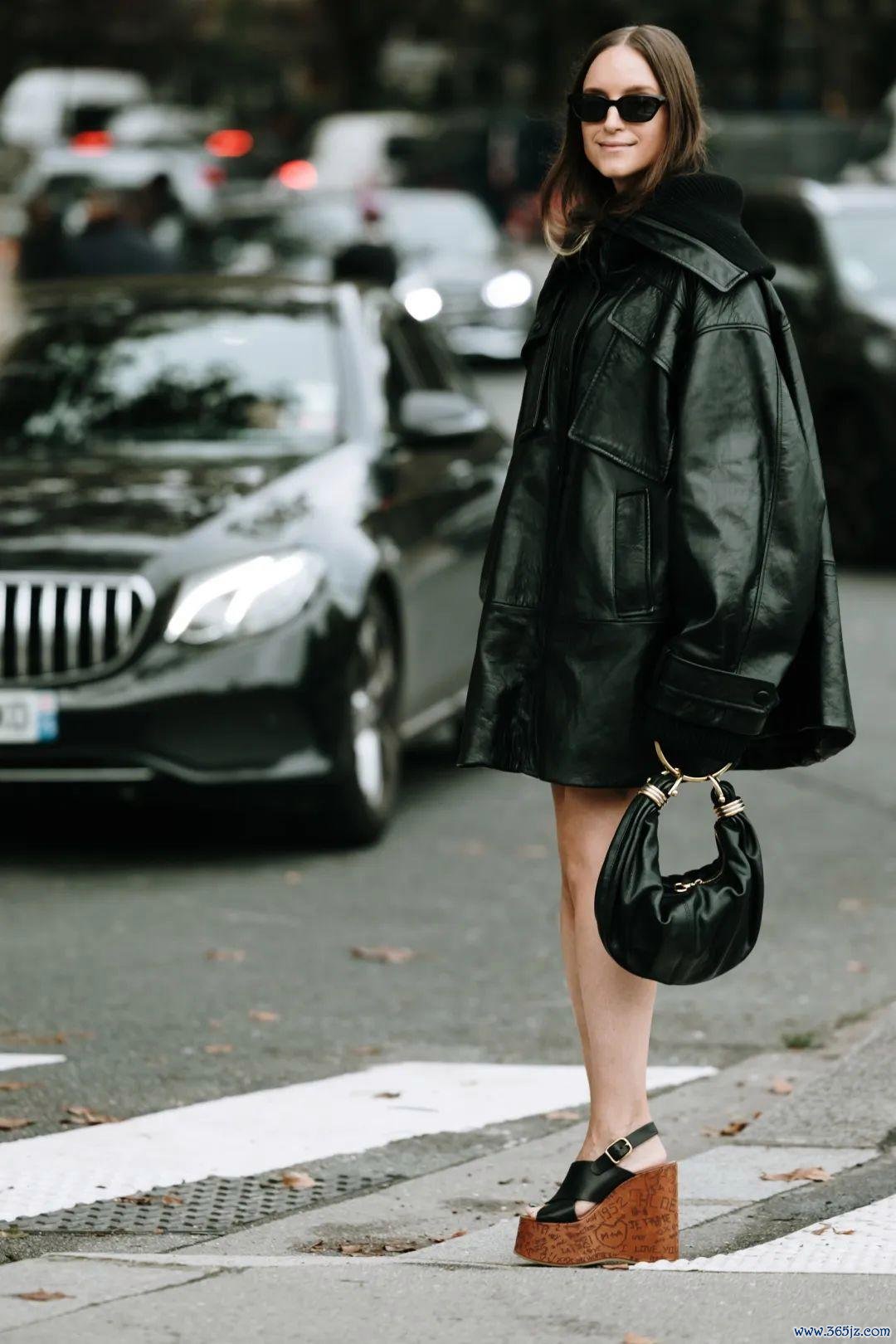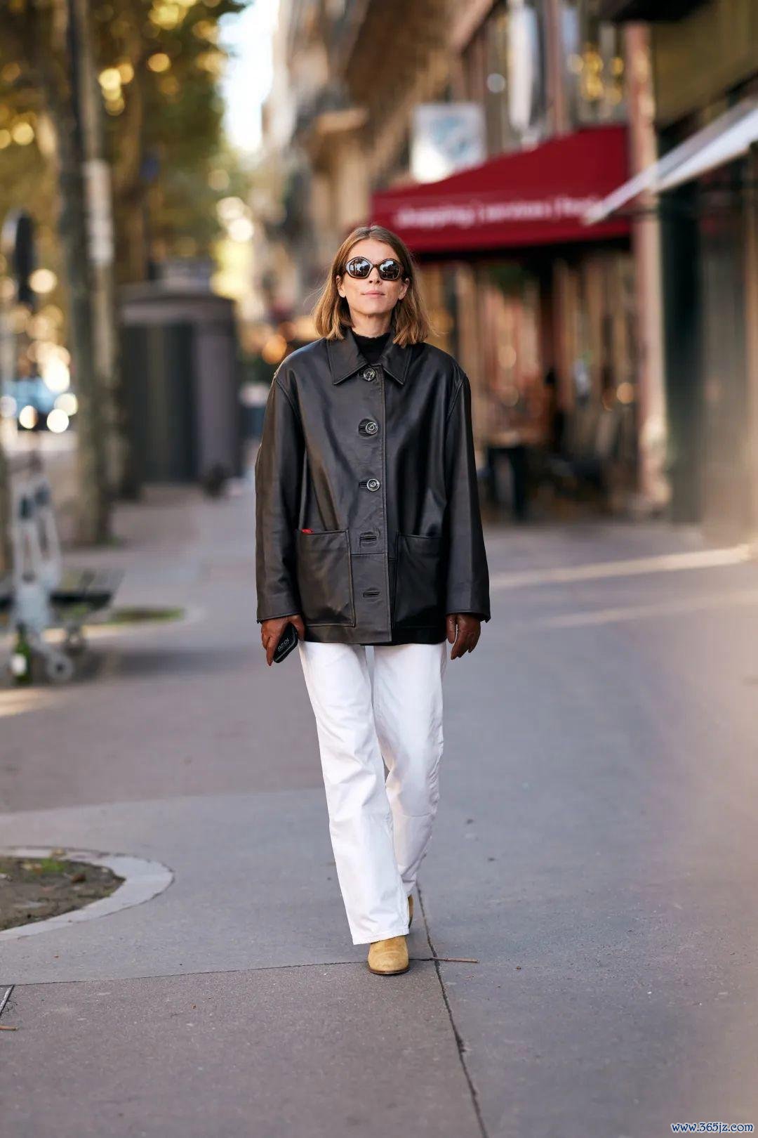 宽松H型皮夹克不错配一条腰带,收紧腰围,凸显出高腰线。