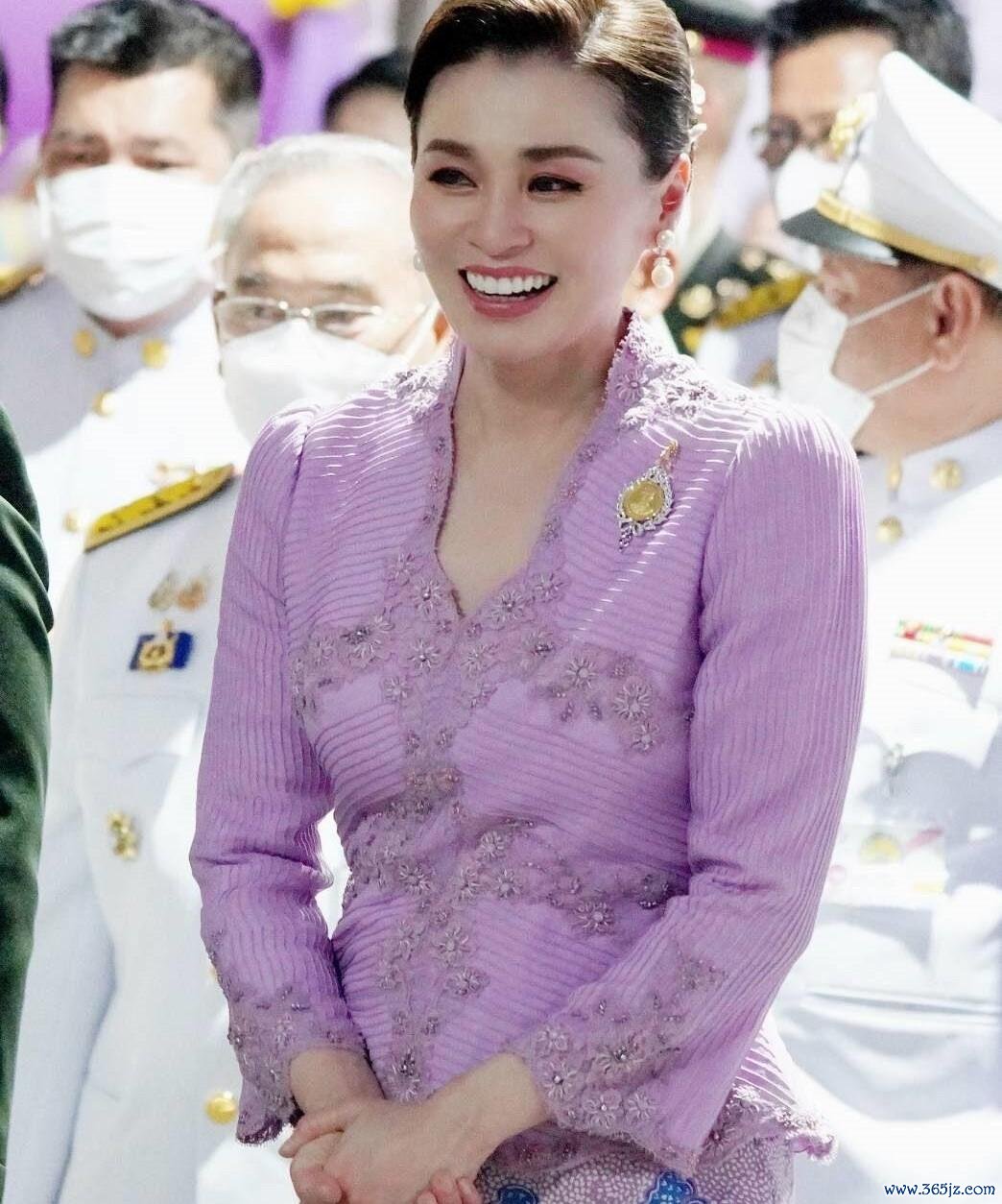 正在举行2024年古兰经朗诵比赛的授奖典礼,哎呀,苏提达王后又换了孑然衣服!此次她身穿一件紫粉色的泰式传统服装。